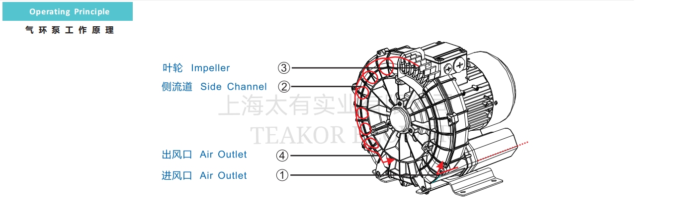 電解液攪拌專用高壓風(fēng)機工作原理高壓風(fēng)機葉輪直接安裝在電機轉(zhuǎn)子上,是完全地?zé)o接觸壓縮。由于泵軸安裝在壓縮腔外,所以即便工作在最大的壓差下,也能確保機械的最大工作可靠性。氣體由吸氣口1吸入,但它進入側(cè)通道2以后,旋轉(zhuǎn)葉輪3在旋轉(zhuǎn)方向上給氣體一個速度同時葉片上離心力使氣體向外加速且壓力增加。隨著旋轉(zhuǎn)的進行,氣體的動能增加,使的沿側(cè)通道的氣體壓力進一步增加。隨著側(cè)通道在出口變窄,氣體被葉片并通過出口消音器4排除泵體。
