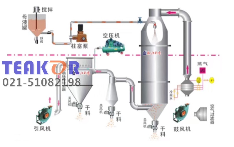 采用高壓泵通過(guò)噴嘴將料液霧化,霧滴與經(jīng)過(guò)熱風(fēng)分布器調(diào)節(jié)后進(jìn)入干燥塔的熱風(fēng)在塔內(nèi)混合,進(jìn)行快速傳熱傳質(zhì),在極短的時(shí)間內(nèi)干燥成為粉粒狀產(chǎn)品。根據(jù)霧化壓力不同分為高壓、中壓和低壓噴霧干燥機(jī),根據(jù)流場(chǎng)的不同分為并流、混流和逆流噴霧干燥機(jī)。